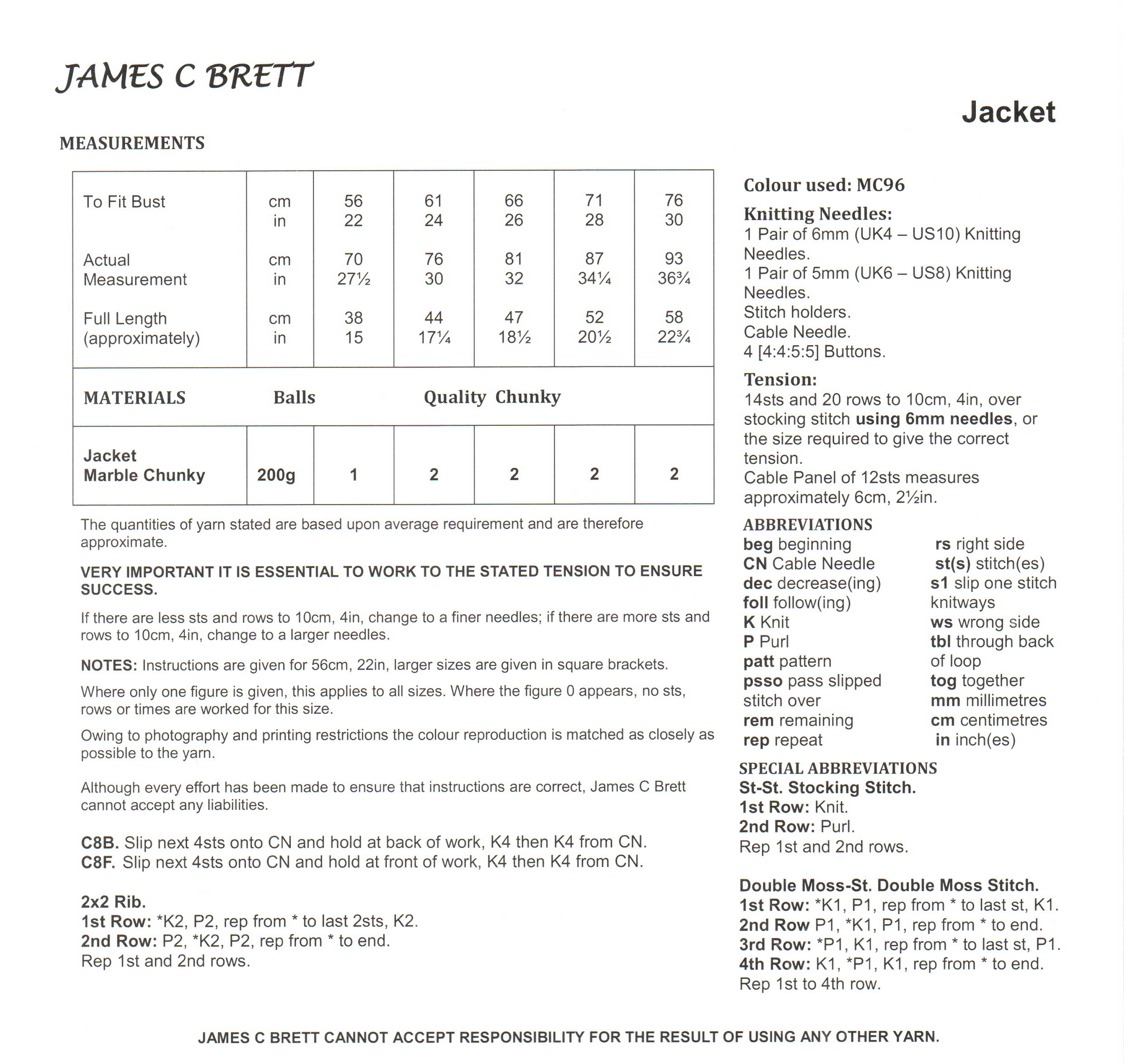 Knitting Pattern Leaflet James C Brett JB699 CHUNKY Jacket
